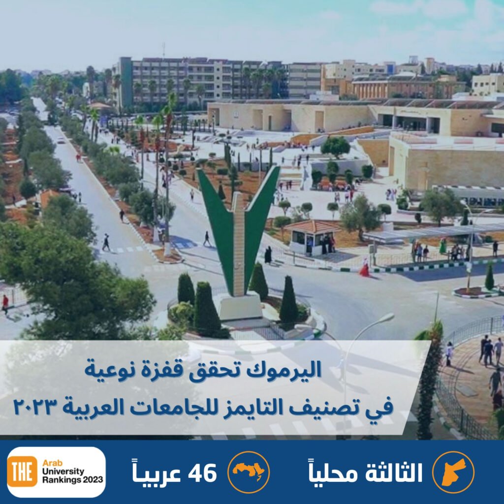 حققت جامعة اليرموك تقدماً كبيرا في ترتيبها في تصنيف التايمز للجامعات العربية 2023، حيث حلّت في المرتبة الثالثة على المستوى المحلي، وفي المرتبة 46 على المستوى العربي، بعد تحقيقها لقفزة نوعية وتقدمها 15 درجة بعد ان تم تصنيفها العام الماضي ضمن فئة (61-70) عربياً العام الماضي.