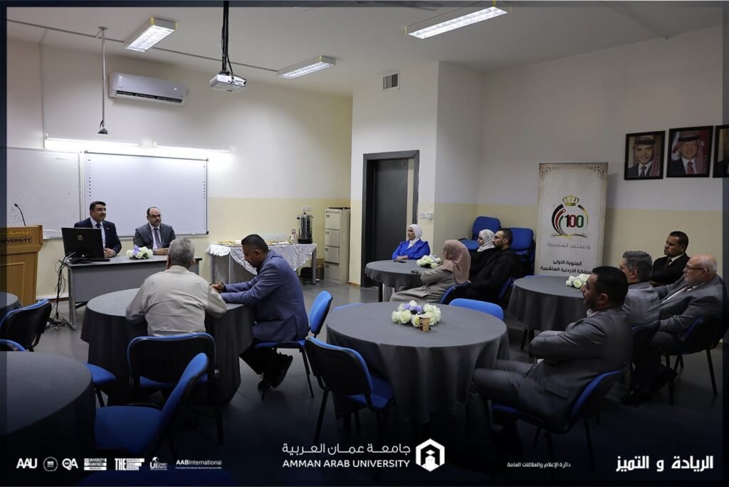ضمن استكمال فعاليات الورش التدريبية الخاصة بأعضاء الهيئة التدريسية في جامعة عمان العربية وبإشراف من دائرة التطوير الأكاديمي في الجامعة ومندوباً عن رئيس الجامعة الأستاذ الدكتور محمد الوديان كرّم الأستاذ الدكتور إسماعيل يامين مساعد رئيس الجامعة للشؤون الأكاديمية مدربي الورش التدريبية للفصل الدراسي الأول من العام الجامعي 2023-2024 وبحضور كّل من الدكتور حسام الحمد مساعد الرئيس للتخطيط وضمان الجودة والدكتور أحمد الحسبان مدير مركز التطوير الأكاديمي وضمان الجودة.