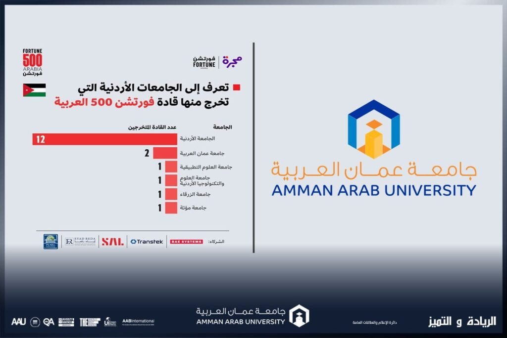 حصلت جامعة عمان العربية على المركز الثاني على مستوى الجامعات الأردنية في تصنيف فورتشن 500 العربي والذي يضم الجامعات التي تلعب دوراً رئيسياً في تخريج القادة التنفيذيين لأكبر الشركات والمؤسسات في المنطقة، ويؤكد على تفوقها بالجوانب الأكاديمية والبحثية. وقد ضم التصنيف أكبر 51 جامعة تخرج منها قادة شركات فورتشن 500 العربية، حيث شمل الجامعات التي درس بها القادة في المرحلتين الجامعية والدراسات العليا، وتضمنت القائمة 51 جامعة موجودة في 14 بلد عربي من بينها الأردن والسعودية ومصر والإمارات والكويت وعمان والمغرب وغيرها.
