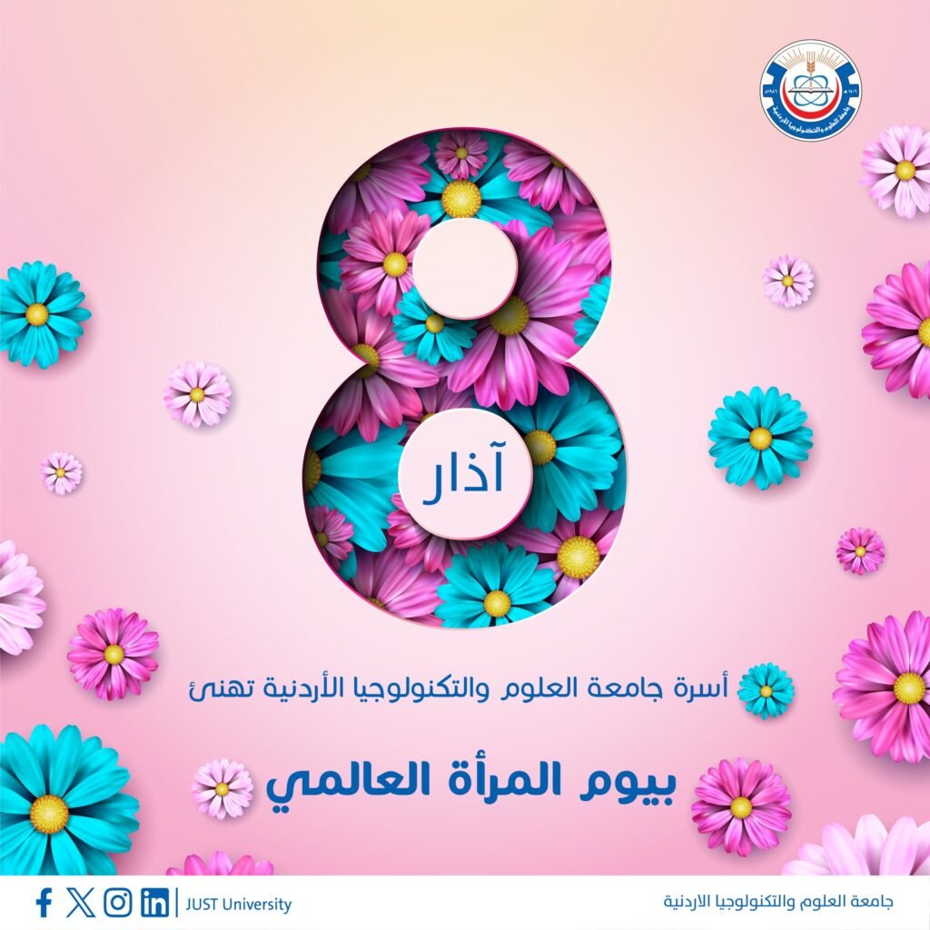 هنأ رئيس جامعة العلوم والتكنولوجيا الأردنية الأستاذ الدكتور خالد السالم سيدات الجامعة من الأسرتين الأكاديمية والإدارية، وطالبات الجامعة بمناسبة يوم المرأة العالمي.