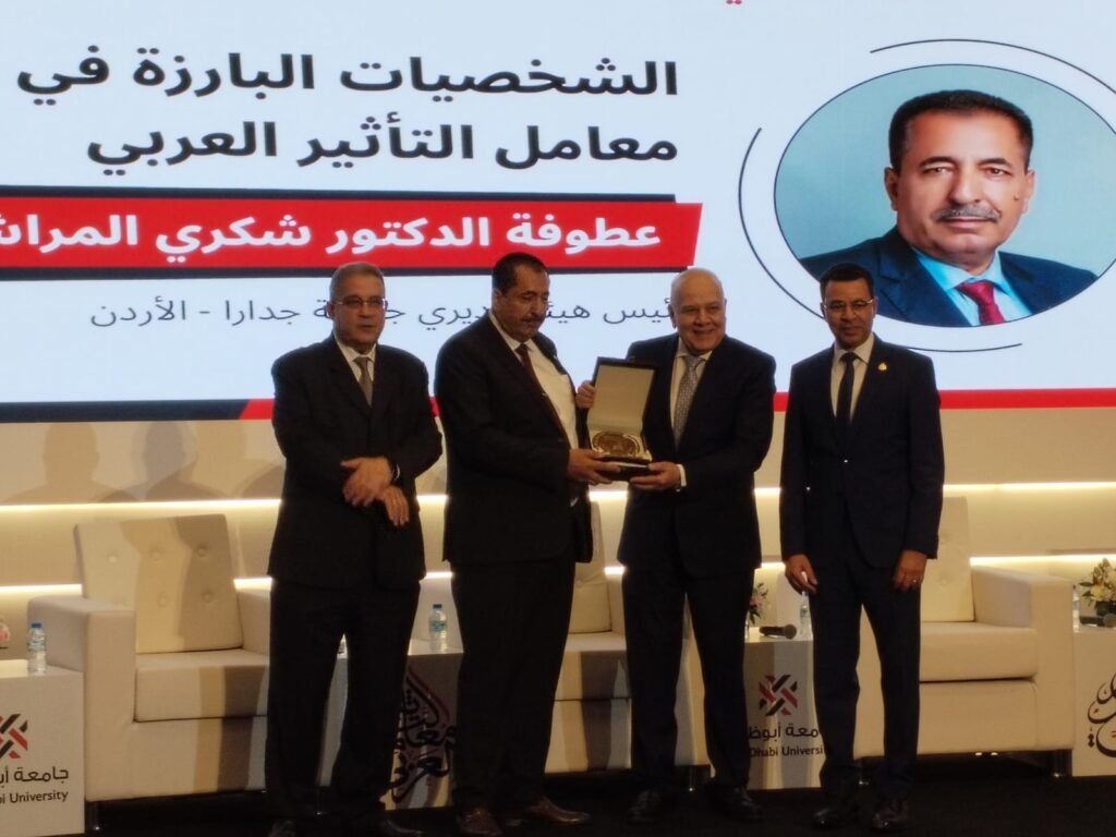 كرم مؤتمر معامل التأثير العربي التاسع عطوفة الدكتور شكري المراشدة رئيس هيئة المديرين_المدير العام لجامعة جدارا بجائزة الشخصية البارزة للعام ٢٠٢٤ في مؤتمر معامل التأثير العربي التاسع الذي افتتحت فعالياته اليوم الخميس 2/5/2024، في جامعة أبوظبي في دولة الإمارات العربية المتحدة برعاية معالي الأستاذ الدكتور عمرو عزت سلامة الأمين العام لاتحاد الجامعات العربية وبحضور معالي الأستاذ الدكتور محمود عبدالعاطي مدير مشروع معامل التأثير العربي والاستاذ الدكتور غسان عواد مدير جامعة أبوظبي وعدد من رؤساء الجامعات العربية والمشاركين العرب.