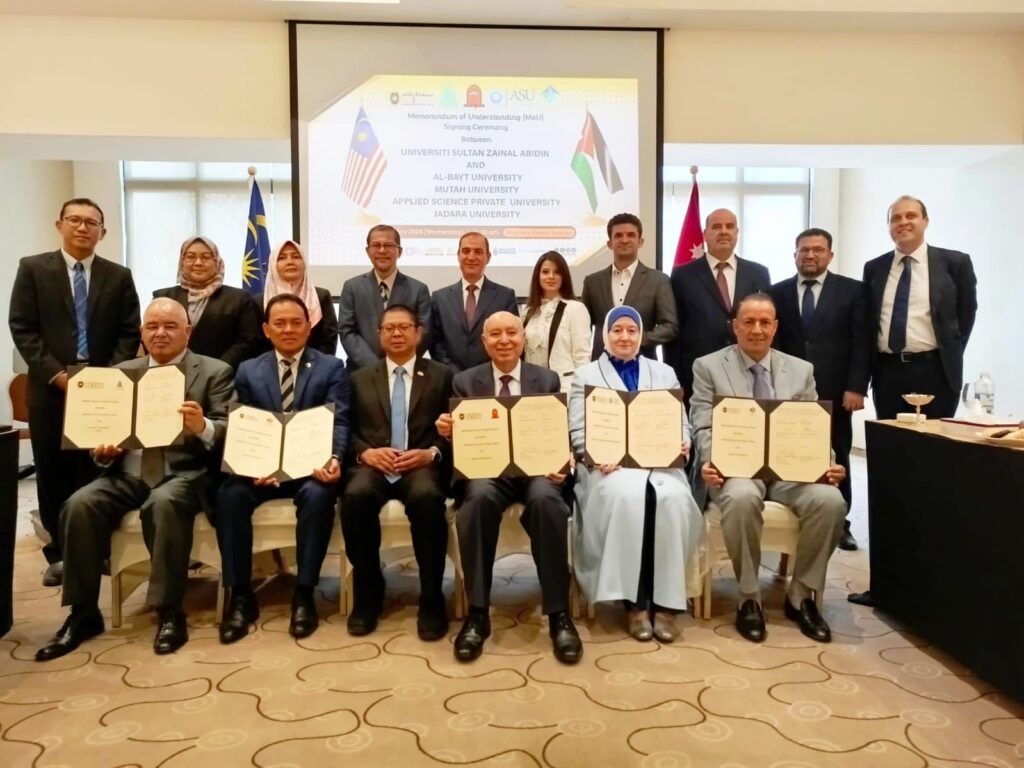 بدعوة كريمة من سفارة ماليزيا في المملكة الأردنية الهاشمية، وقعت جامعة جدارا مذكرة تفاهم مع جامعة سلطان زين العابدين الماليزية يوم الأربعاء، الموافق 22 مايو 2024، في فندق الريجنسي بالعاصمة عمان. حضر مراسم التوقيع سفير ماليزيا في الأردن، السيد محمد نصري بن عبد الرحمن.
