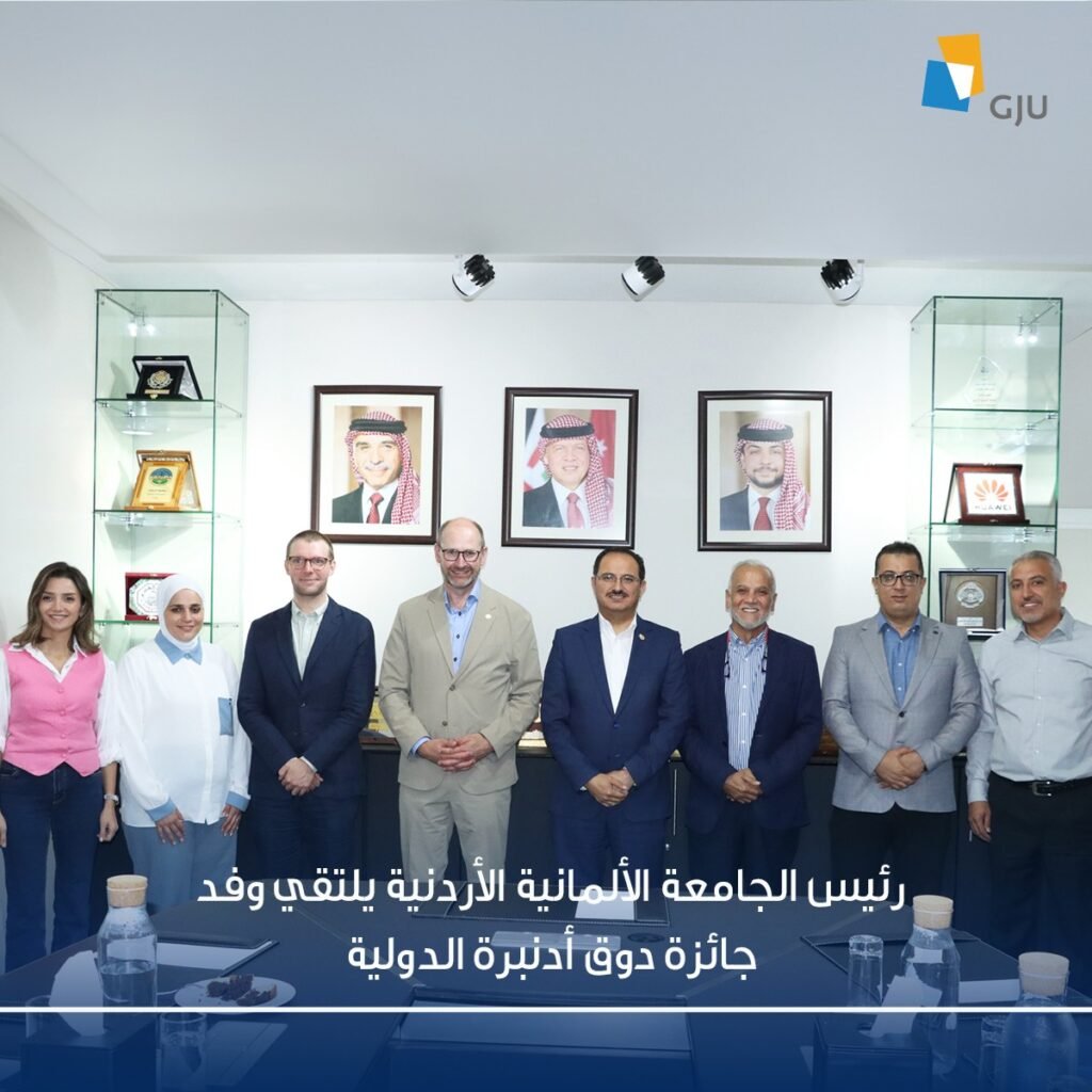 التقى رئيس الجامعة الألمانية الأردنية، الأستاذ الدكتور علاء الدين الحلحولي، بحضور مدير جائزة الحسن للشباب، معالي السيد أيمن المفلح، وفد جائزة دوق أدنبرة الدولية المؤلف من الأمين العام مارتن براون ومدير العمليات جيمي لوك.