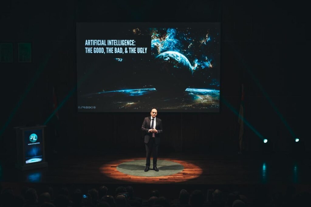 وأشارَ أثناءَ محاضرةٍ نظّمتها وحدةُ البرنامجِ الدّوليِّ والتّسويقِ والخرّيجينَ في الجامعةِ الأردنيّةِ اليوم ضمنَ سلسلةِ “أحاديثُ الأردنيّة”، بحضورِ رئيسِ الجامعة، ونوّابِه، وجمعٍ غفيرٍ من الأساتذةِ والطّلبة، إلى الفارقِ الكبيرِ الّذي أحدثَتْهُ النّماذجُ اللُّغويّةُ الكبيرةُ منذ عام 2021؛ وهذا جعلَ هذه الأدواتِ متاحةً للجميع، متوقّعًا تغييراتٍ جذريّةً مستقبليّةً مع اندماجِ تقنياتِ الحوسبةِ الكمّيّةِ والذّكاءِ الاصطناعيّ.