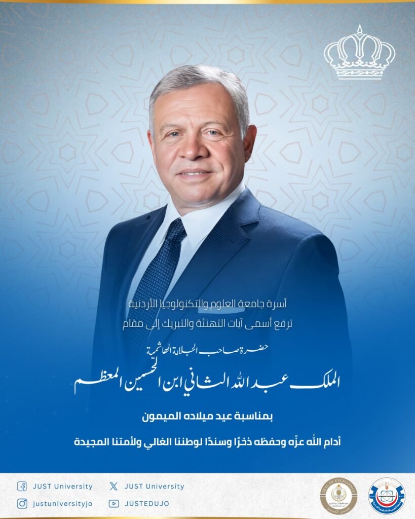 جامعة العلوم والتكنولوجيا الأردنية تهنئ جلالة الملك عبدالله الثاني بعيد ميلاده الميمون