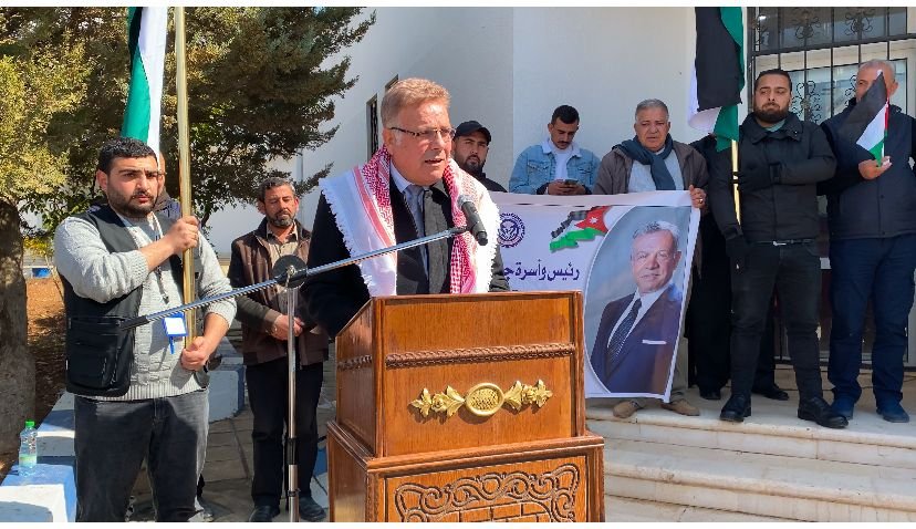 وأكد في كلمته أن مواقف جلالتهِ كانت وستبقى سفراً من أسفارِ المجدِ الأردني العربي الهاشمي، وشاهداً حياً وخالداً على ما غرسهُ ويغرسهُ الهاشميون فينا من تضحياتِ وقيمٍ ومبادئَ في الدفاعِ عن قضايا الوطنِ والأمة، وفي مقدِمتها القضيةُ الفلسطينية، التي كانت وستبقى قضيتُنا المركزية، واختتم كلمته أن يحفظ الله الأردن وأن يحفظ الله قائدنا حضرة صاحب الجلالة الملك عبد الله الثاني ابن الحسين المعظم، وولي عهده الأمين.