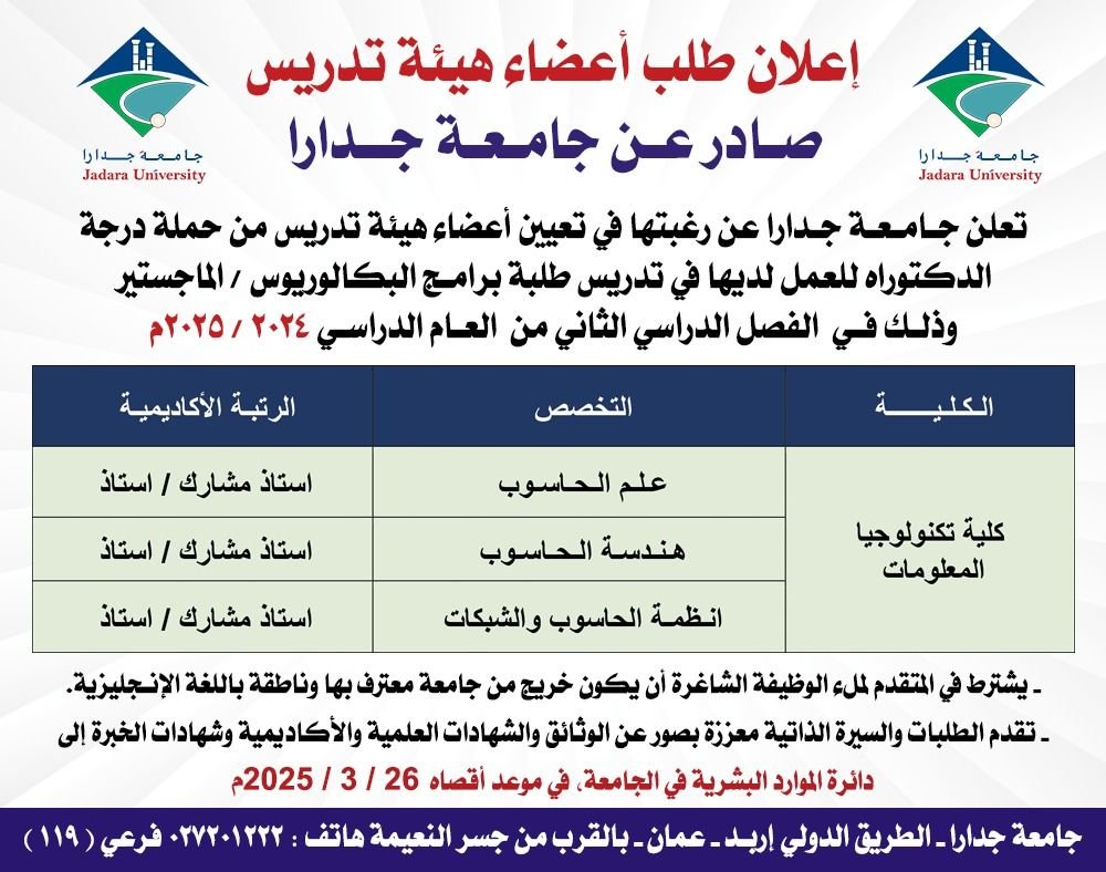 إعلان توظيف في جامعة جدارا