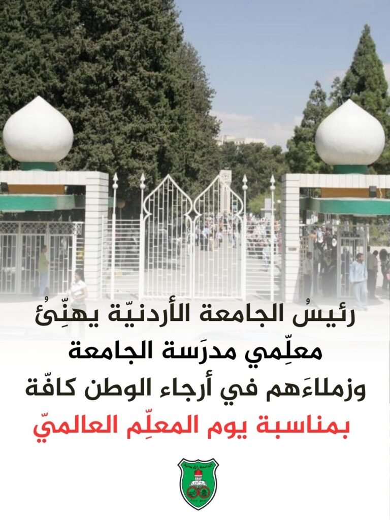 يتقدّم رئيس الجامعة الأردنيّة الدكتور نذير عبيدات، باسمه واسم أسرة الجامعة، بأحرّ التهاني والتبريكات إلى معلمي ومعلمات الوطن بمناسبة اليوم العالميّ للمعلِّم الذي يصادف اليوم الأحد.