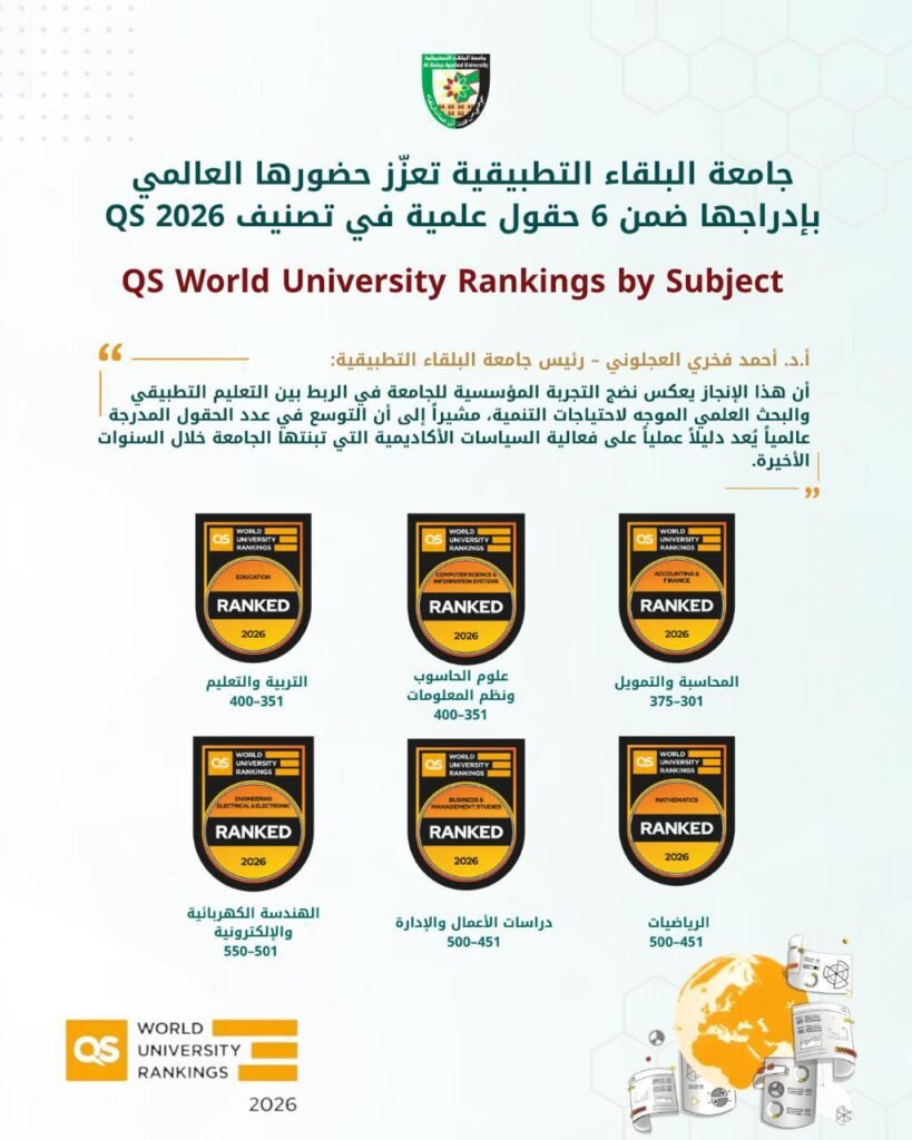 ويؤكد هذا الإنجاز استمرار التزام جامعة البلقاء التطبيقية بتعزيز تنافسيتها الدولية، والمضي في مسار التميز والتطوير المؤسسي، بما ينسجم مع رؤيتها الاستراتيجية للأعوام 2026–2030.